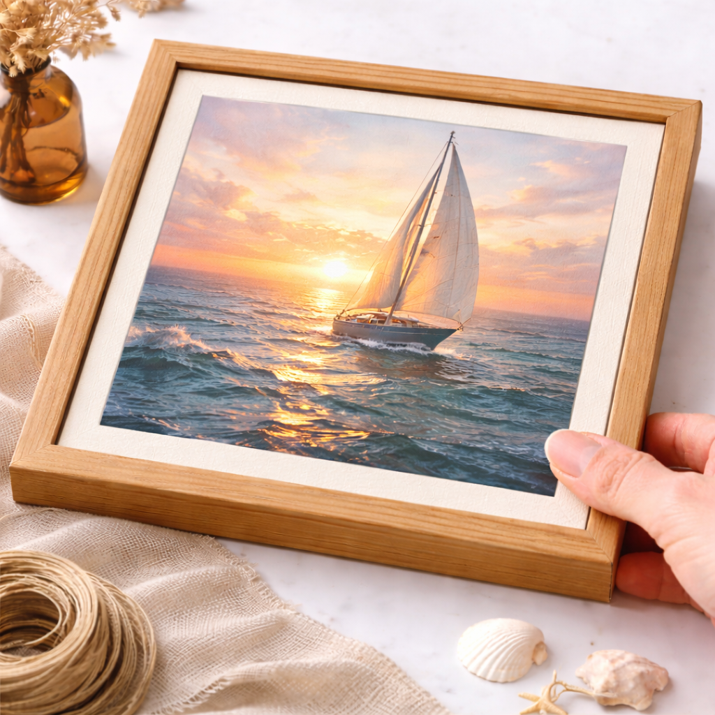 Cornice in legno naturale o verniciato che valorizza l’opera senza coprirne i bordi.